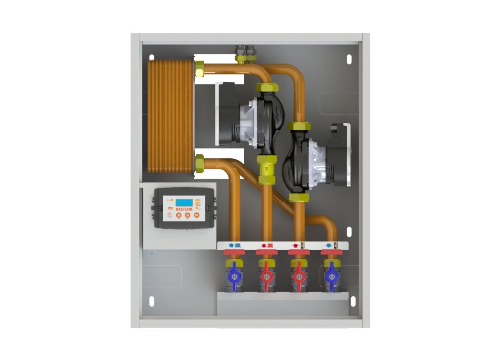 Grazie al modulo di interfaccia è possibile separare idraulicamente i due circuiti tramite scambiatore a piastre senza sommare le potenze dei due generatori.