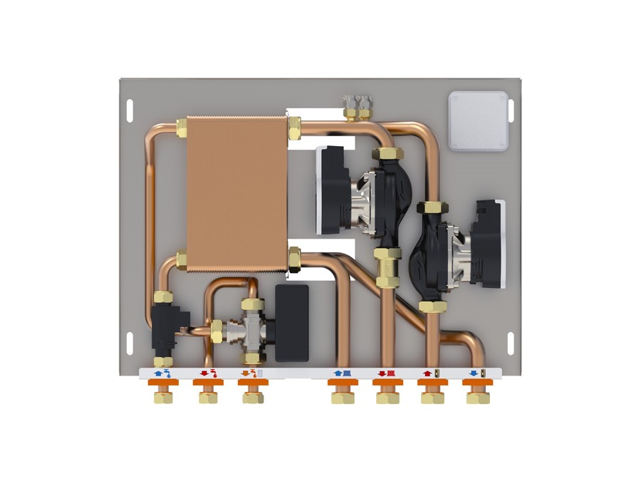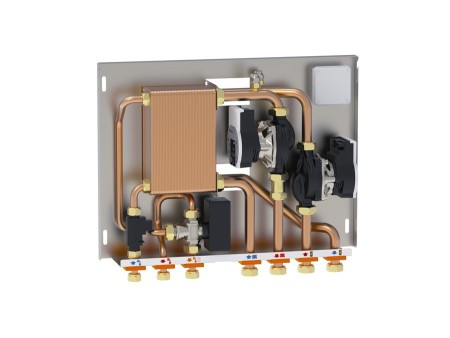 Modulo per la separazione idraulica come MX135/1 con valvola deviatrice per invio acqua fredda al generatore che può produrre ACS, scambiatore a tre circuiti per la produzione di ACS.